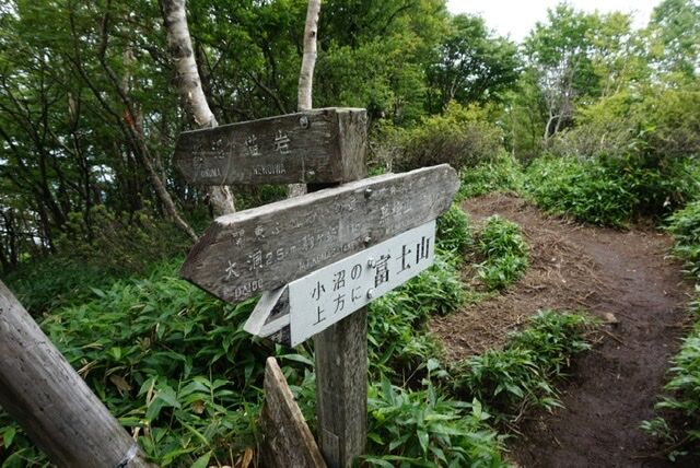 登って尾根に出ると先ほど歩いてきた大沼が見えました。沼の奥に見える山が地蔵岳(標高1674m)です。地蔵岳にはアンテナが立っているのですがその先に晴れていると富士山が見えるみたいです。ただ、この日は曇天なので当たり前ですが見えません。群馬から富士山って結構な距離がありそうですがみえるのは率直にいってすごい!!