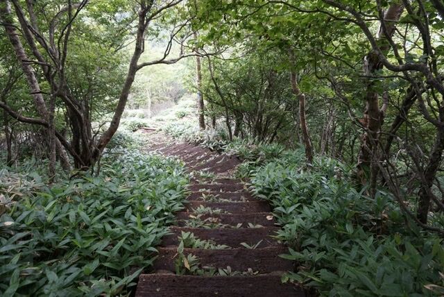 大沼へは急な階段と岩がちの下山道です。階段は鉄でできており、雨が降っていたりあがった後は非常に滑りやすいので注意が必要ですし、岩がちの道を下ると足を捻りそうになります。